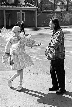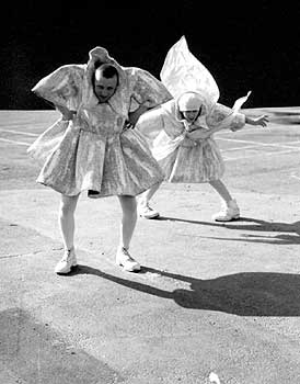 А.: В конце спектакля появляется, плывя по воде, изящный макет Геллерау – сверкающий, изо льда, безупречный, как идея его создателей – город-сад. Фонтан горячей воды... и он тает. Пригасает свет. Канатоходец пересекает площадь. Старый человек рисует на воде. Заканчивает иероглиф. Грохот и глупый общий свет. Реальность полуразрушенного настоящего... | ![]() |