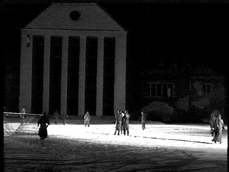 А.: Теперь я буду рассказывать только фрагменты. Звук вертолета. Полицейский вертолет со светом и звуком на днище. Свет с вертолета скользит по плацдарму, доносится советско-немецкая песня "Все выше, и выше, и выше стремим мы полет наших птиц, ..." Взлетает , унося с собой огромный кусок материала, обнажая гладь парящей воды. По краям стоят световые вышки. Они провожают ветролет. Лучи встречаются в небе. И опускаются неподвижную поверхность воды, как в черное дымящееся зеркало.В центре танцует женщина. Материнское соло. Со стороны ворот бьет луч на знак Инь-Янь под крышей Геллерау. Из этой амбразуры в сгустках дыма вываливаются люди, один за одним. Исход. Они заполняют всю площадь.... Я бы не хотел растолковывать дальше. Ю.: Верно. Детализировать не стоит. |